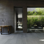 L’ingresso principale della casa sembra essere la porta di un monumento medievale. Gli interni di Concrete House II sono tutti progettati in un layout open space con divisori parziali murati, abitabile da dodici persone, con una grande sala da pranzo e la lussuosa zona living contemporaneo. La grande cucina in antracite e toni di bianco di zinco presenta angoli leggermente non convenzionali e una stufa a isola centrale con un moderno angolo cottura laccato nero, così come un grande bar.