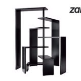 I ripiani sono realizzati in MDF con elemento angolare interno di rinforzo in acciaio, la verniciatura goffrata antigraffio viene realizzata nei colori bianco, nero, bordeaux o petrolio. Gli snodi portanti sono in acciaio verniciato nero nelle versioni nera, bordeaux o petrolio oppure bianco nella versione bianca.