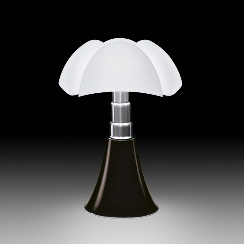La lampada Pipistrello Martinelli Luce viene realizzata con tecniche di stampaggio sia del telescopio che del diffusore in metacrilato, innovative per l’epoca in cui è stata progettata. La forma sfuggente della base conica si sviluppa verso l’alto, ampliandosi con un movimento fluido verso le nervature del diffusore. Il diffusore è in metacrilato bianco opale e la base in metallo alluminio satinato, laccato bianco, marrone scuro testa di moro, rosso porpora o nero brillante.