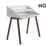 Materiali: Gambe in noce canaletto massello, piano d’appoggio per il box scrittoio in multistrato di faggio tinto noce, box-scrittoio in MDF laccato opaco.