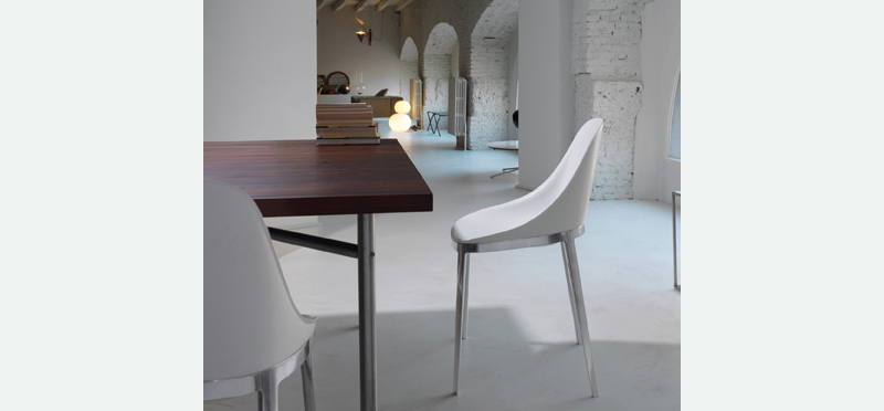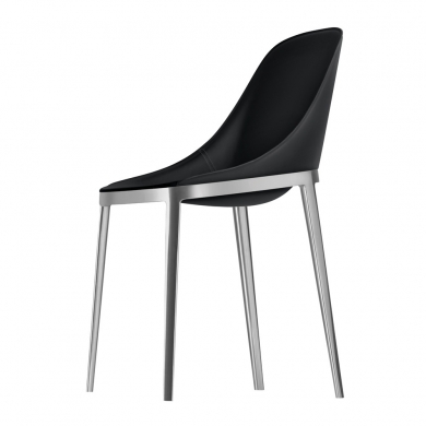 La struttura in alluminio verniciato o lucidato può supportare la scocca in poliuretano TECH® in diversi colori o interamente rivestito in cuoio. La confortevole scocca in poliuretano TECH® , con o senza braccioli, può inoltre ospitare un cuscino interno rivestito in tessuto Kvadrat® o in pelle.
