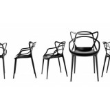 Masters Kartell, disponibile in sei colori, può essere utilizzata anche all’esterno ed è impilabile fino a quattro pezzi.