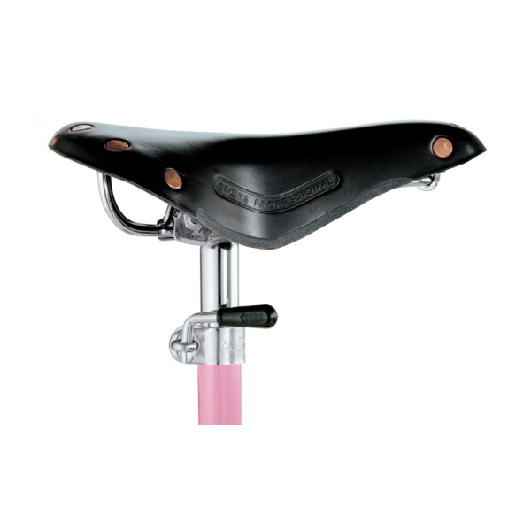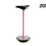 Realizzata con elementi industriali già esistenti Sella è infatti stato progettato partendo da un vero sellino in cuoio di una bicicletta da corsa, regolabile in altezza, fissato su un asse alta 71 cm in acciaio verniciato rosa e una base in ghisa semisferica gommata nella parte inferiore che gli permette di essere “sempre in piedi”, un bizzarro punto d’appoggio per brevi soste.