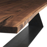 Il piano del tavolo è disponibile in legno massello di noce con nodi o rovere con nodi, con spessore di circa 5 cm, combinato con il ferro grezzo della base, forgiata e saldata a mano, disponibile in finitura naturale o ad olio e in alternativa verniciata nei colori RAL opaco.