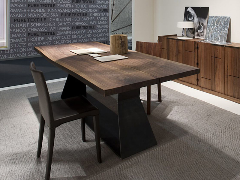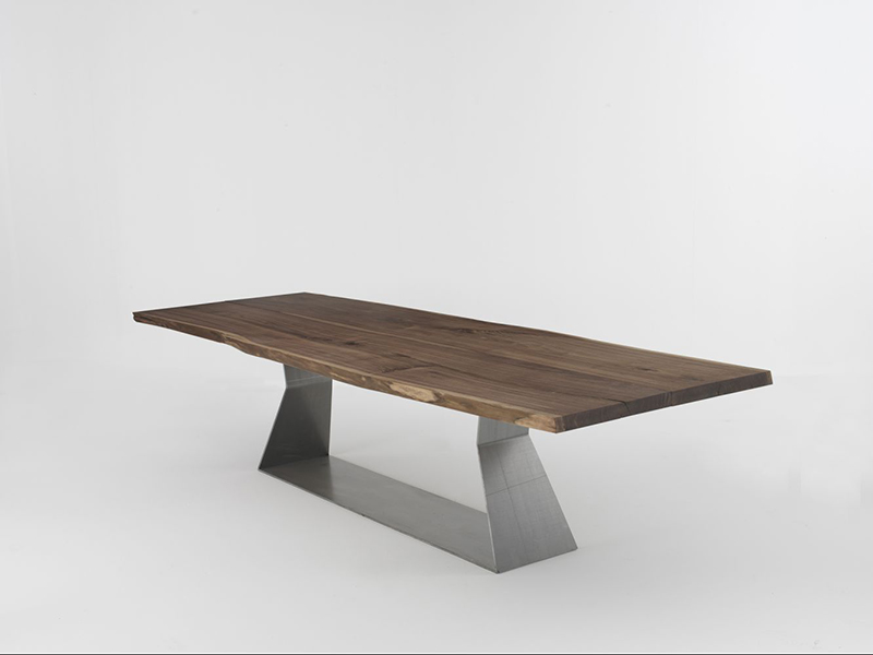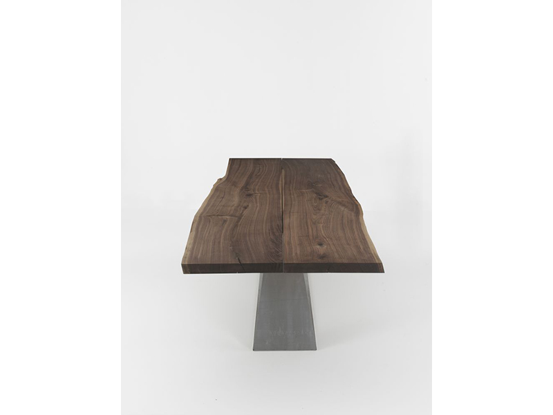 Il piano del tavolo è disponibile in legno massello di noce con nodi o rovere con nodi, con spessore di circa 5 cm, combinato con il ferro grezzo della base, forgiata e saldata a mano, disponibile in finitura naturale o ad olio e in alternativa verniciata nei colori RAL opaco.