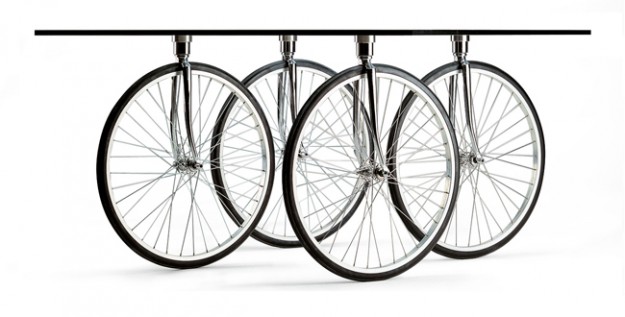 Le gambe sono sostituite da ruote di bicicletta, fissate al piano in vetro temperato molato (spessore 15 mm) con quattro piattelli in acciaio inox, le ruote sono pivotanti a 360°.