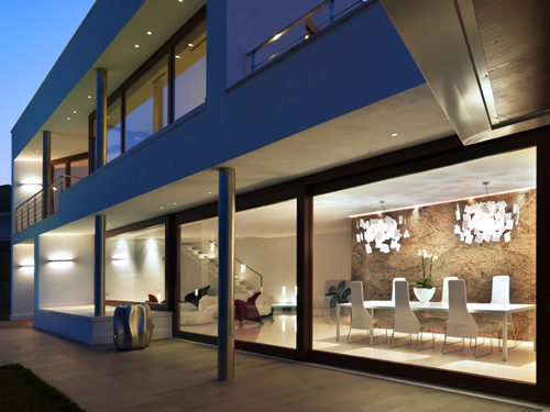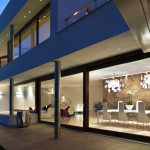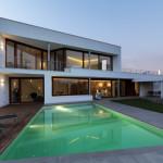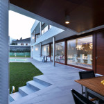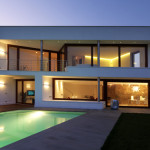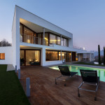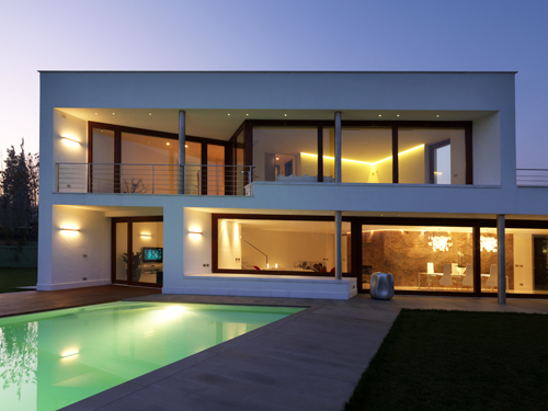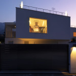 Il primo piano, riservato ai padroni di casa, ospita un’ampia camera, la cabina armadi e la sala da bagno. I tetti piani fungono da ampi terrazzi, alternative sospese al relax del giardino.  Con il buio della notte vengono messi in evidenza i profondi volumi, evidenziati da tagli luminosi e contrasti chiaro / scuro.