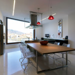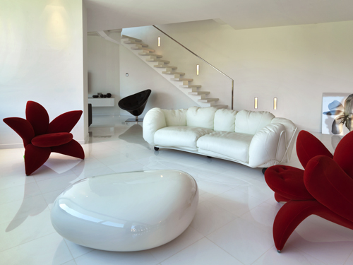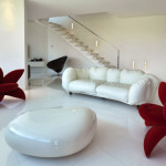 Il piano soggiorno è uno spazio immacolato, corrotto dalla matericità di una parete in pietra fossile e dalle macchie di colore di alcuni elementi d’arredo.