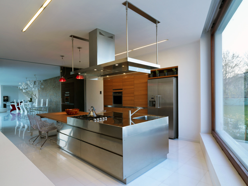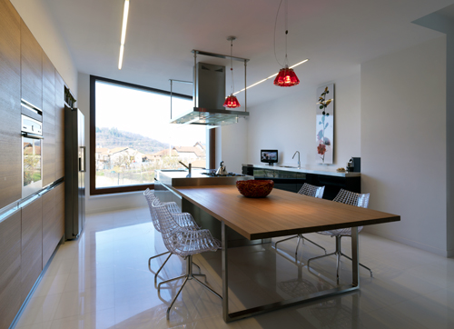 La residenza unifamiliare B House, realizzata dagli architetti Duilio Damilano e Claudia Allinio nella provincia di Cuneo, si estende in orizzontale su una superficie di 355 mq con una serie di locali in fila che finiscono con la cucina, che sovrasta l’accesso all’autorimessa e sorveglia l’ingresso alla proprietà.